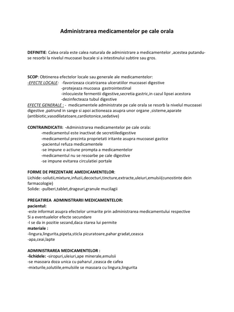 Administrarea medicamentelor pe cale orala. 6 10 administrarea medicamentelor pe cale nazal prin instilaie pag 87. Administrarea medicamentelor pe cale orală la adult obiectivele procedurii introducerea în organism pe cale orală a unei cantităţi de medicamente care să acţioneze general sau local. Medicamentele lichide pot fi sub forma de. 3 6 11 administrarea medicamentelor în conductul auditiv extern prin instilaie pag 89 6 12 administrarea medicamentelor pe tegumente pag 90 6 13 administrarea medicamentelor pe cale rectal pag 92 6 14 administrarea medicamentelor pe sonda nazogastric i gastrostom pag 93.