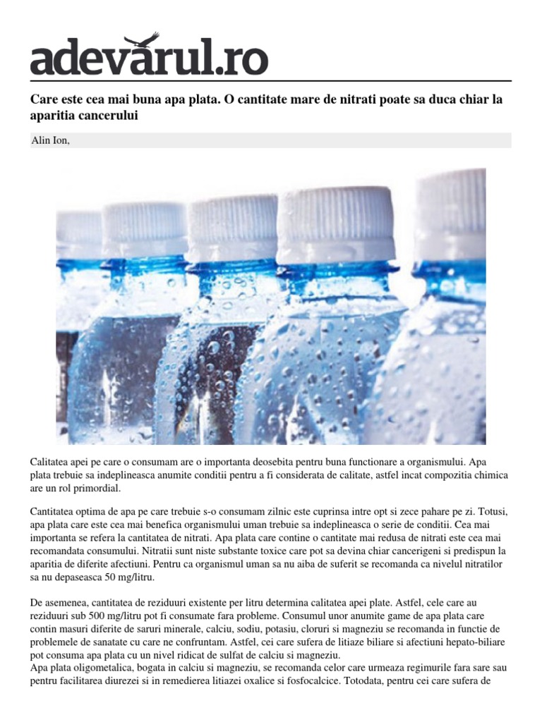 Care e cea mai buna apa plata. Pe de alta parte nu exista apa minerala identica cu alta asa cum niciun organism nu este asemanator altuia. La acest moment recomand. Asociația pro consumatori a realizat un top 10 al celor mai bune ape minerale plate din românia în funcție de conținutul acestora cu un conținut ridicat de calciu de magneziu cloruri potasiu sodiu și sulfiți. Izvorul apei plate bucovina se afla in suceava in localitatea dorna candrenilor.