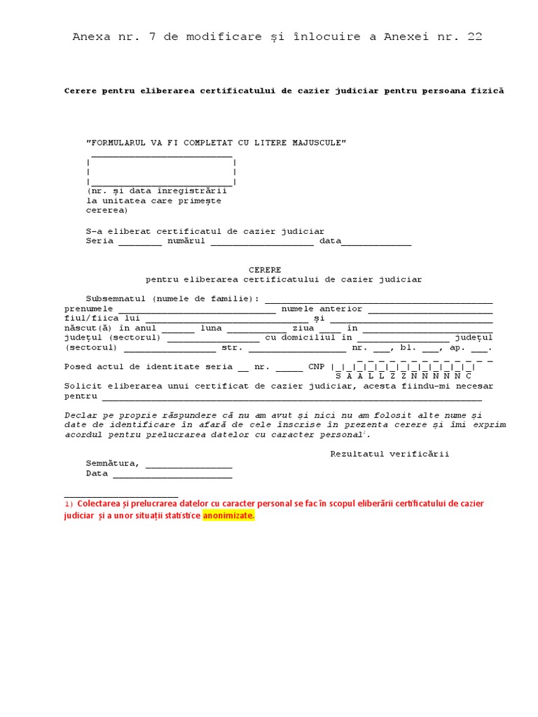 Solicit eliberarea unui certificat de cazier judiciar acesta fiindu mi necesar pentru declar pe propria răapundere că nu am avut și nici nu am folosit alte nume și date de identificare în afara de cele înscrise în prezenta cerere și îmi exprim acordul pentru prelucrarea datelor cu caracter personal1. Anexa 22 cerere pentru eliberarea certificatului de cazier judiciar pentru persoana fizică formularul va fi completat cu litere majuscule nr. 22 la hotärârea guvernului nr. Cerere pentru eliberarea certificatului de cazier judiciar pentru persoana fizică conform prev.