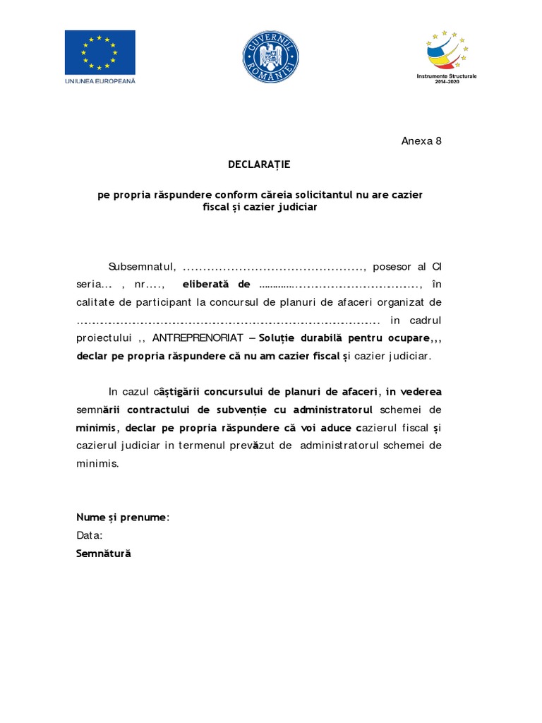 Declaratie pe proprie raspundere privind inscrisurile in cazierul fiscal si judiciar 1 declaratie pe proprie raspundere privind inscrisurile in cazierul fiscal si judiciar. Declaraţie pe propria răspundere privind cazierul doc. Cazier 04. Declaratia proprie raspundere cazier judiciar ca nu ati suferit nicio condamnare completata si scanata pdf declaratia pe proprie raspundere adeverinta capacitate deplina pentru exercitarea profesiei completata si scanata pdf 2 raportul semnat olograf scanat pdf cand nu exista semnatura electronica.