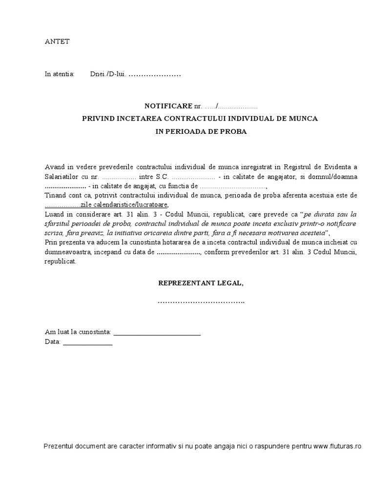 Demisia in perioada de proba. Perioada de probă constituie vechime în muncă. Merita mentionat ca perioada de proba nu este obligatorie ci reprezinta doar un instrument de a testa cunostintele si abilitatile salariatului pentru a vedea daca va fi un bun. Perioada de proba este de luni calendaristice pot trece in acea solicitare notificare cerere de demisie conform art. Este posibila inaintarea demisiei in perioada de proba.