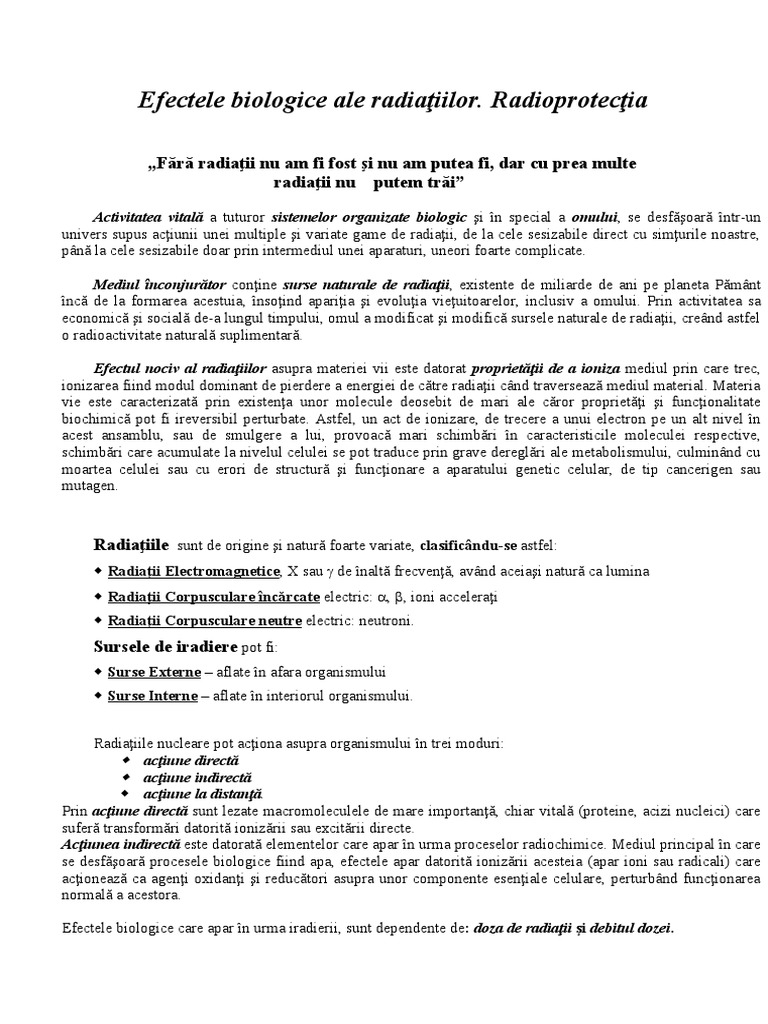 Efecte biologice ale radiatiilor. Efectele biologice ale radiaţiilor de felix dragoi pe mai 13 2013 activitatea vitală a tuturor sistemelor organizate biologic și în special a omului se desfășoară într un univers supus acțiunii unei multiple și variate game de radiații de la cele sesizabile direct cu simțurile noastre până la cele sesizabile doar prin intermediul unei aparaturi uneori foarte complicate. Efectele biologice ale radiatiilor ionizante mai jos o sa aveti mai multe rezultate pentru cautarea efectele biologice ale radiatiilor ionizante. Puteti gasi foarte multe referate accesand categoriile din partea dreapta despre efectele biologice ale radiatiilor ionizante. Efectele radiatiilor proiect realizat de.