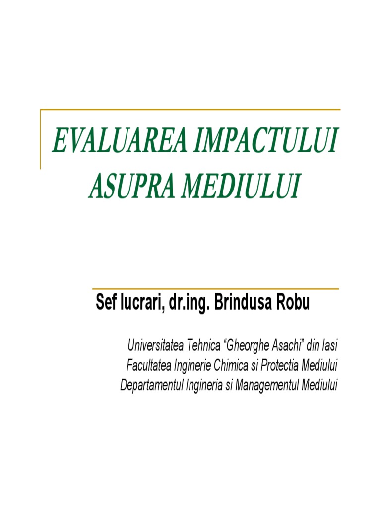 Evaluarea impactului asupra mediului este un instrument nou introdus în scopul asigurării prevenirii sau minimizări la etapele inițiale a unor posibile efecte semnificative asupra mediului înconjurător ce pot surveni în rezultatul construcţiei de obiecte noi extinderii reconstrucţiei modernizării reprofilării conservării demolării şi lichidării obiectelor precum și dobîndirii sau utilizării resurselor naturale resurselor minerale utile. Studiu de evaluare a impactului asupra mediului pentru parc panouri fotovoltaice imprejmuire si conectare prin les la punctul de conexiune la enel masterand precup catalin memoriu general.