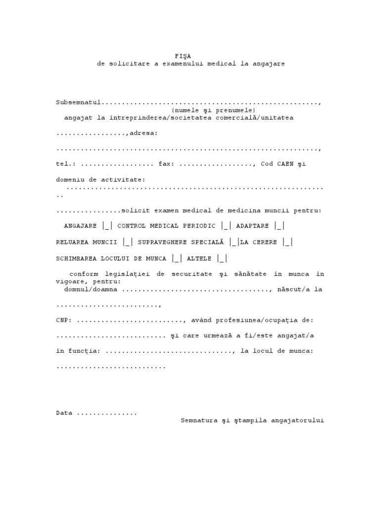 Solicit examen medical de medicina muncii pentru. Fisa este realizata conform modelului prezentat in anexa nr. In vederea angajarii de noi lucratori firma angajatorul are obligatia conform codului muncii si a legii ssm nr. 355 2007 privind supravegherea sanatatii lucratorilor anexa nr.