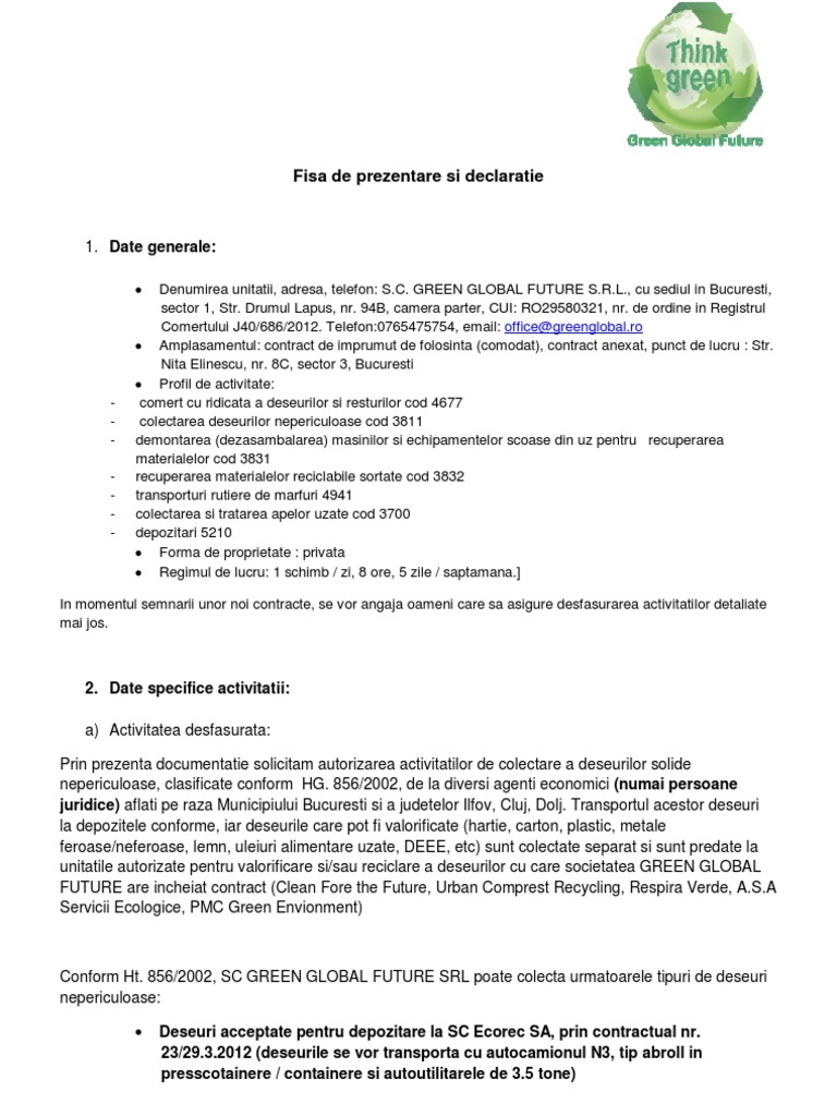 Plopii fara sot nr. Elaborarea fisei de prezentare si declaratie are drept scop obtinerea autorizatiei de mediu pentru activitatea conform cod caen 3811 colectarea deseurilor nepericuloase si cod caen 4941 transporturi rutiere de marfuri desfasurata de s c. Colectare transport pretratare tratare deseuri industriale si deseuri de echipamente electrice si electronice sc eastern europe logistics management srl elaborat aprobat ing. Fişa de prezentare şi declaraţie se elaborează în cadrul procedurii de obţinere a autorizaţiei de mediu structura acestui document trebuie să respecte cerinţele anexei 2 a ordinului 1798 2007.