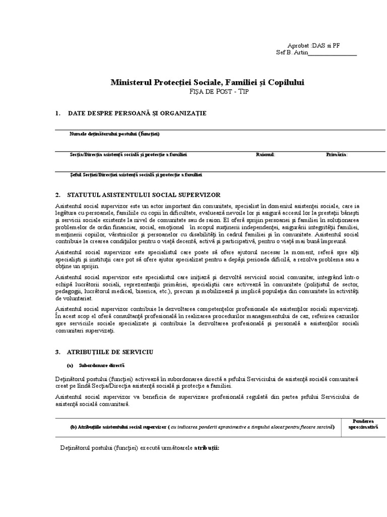 Fisa postului aprobat ing lu f isa post u lui i denumirea postului. Nume si prenume sef ierarhic 6. Asistent social cor 263501. Sunt un ong va rog sa ma ajutati cu fisa de post solicitata mai jos si cu acodul de mediatizare pentru beneficiari angajati voluntari si apartinatori parinte tutore.