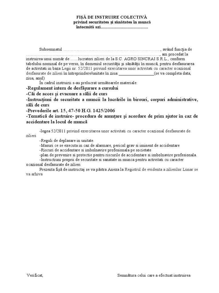 Instructaj pentru securitatea muncii şi în domeniul psi riscurile de accidentare şi îmbolnăvire profesională şi ne obligăm să le respectăm întocmai. Ne adresam cu servicii de protectia muncii firmelor din braila galati si nu numai. Un mecanic agricol supravegheata si intretine starea tehnica a masinilor agricole in mod periodic analizeaza documentatia tehnica specifica efectueaza revizii tehnice periodice la masinile agricole de care raspunde realizeaza reparatii curente si capitael pentru acestea etc. Crt nume şi prenume act identitate grupa sanguină semnătura numele şi prenumele semnătura.