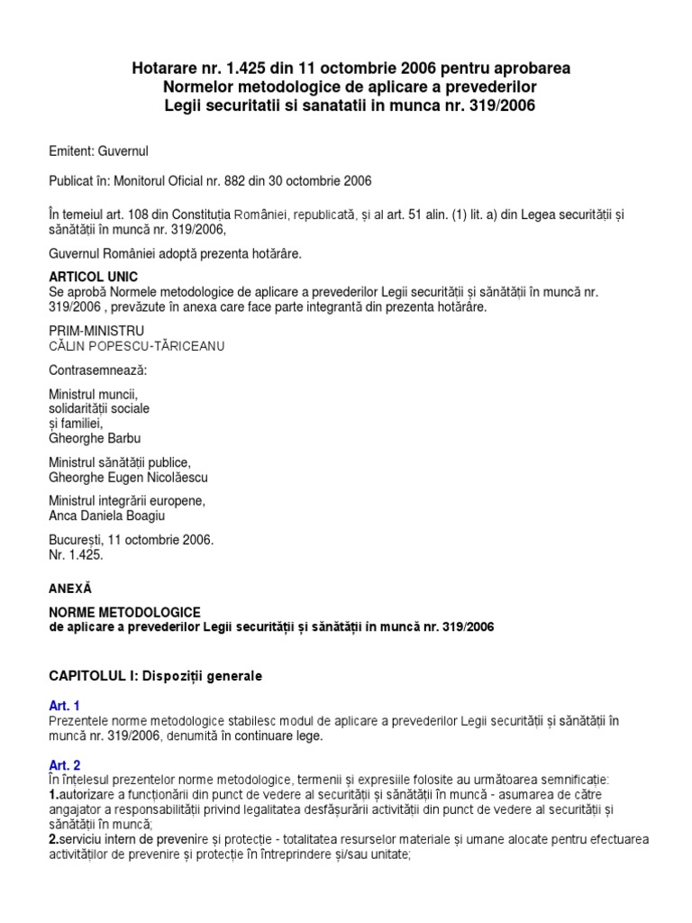 1425 2006 publicata in monitorul oficial al romaniei partea i nr. 955 din 8 septembrie 2010 actualizată pentru modificarea şi completarea normelor metodologice de aplicare a prevederilor legii securităţii şi sănătăţii în muncă nr. Actualizata in 19 octombrie 2016 prin hg 767 din 2016. 1 425 2006 actualizată până la data de 27 decembrie 2011.