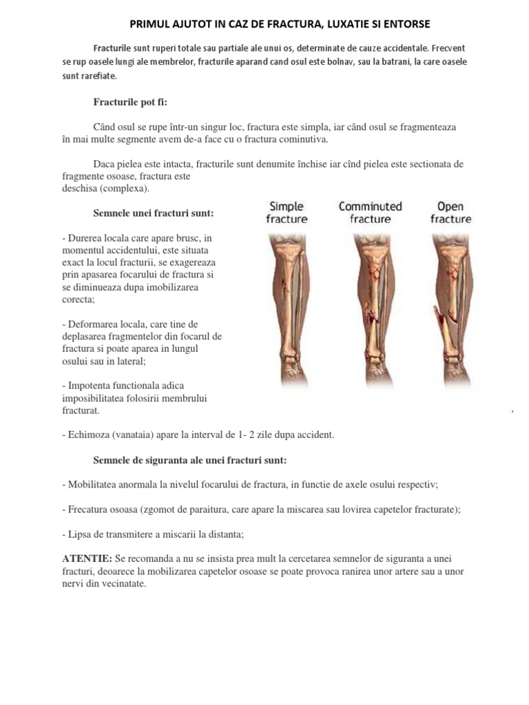 Cuprinzând osul fracturat şi cele două articulaţii respectiv cea superioară şi inferioară. Imobilizarea membrului inferior fracturat al unei victime într un accident de circulaţie se face. Imobilizarea unei fracturi la mâini se face prin fixarea cu atele a două articulații învecinate fracturii mai sus și mai jos de locul fracturii. Cand gura unui ranit ramane inclestata respiratia artificial se poate face.