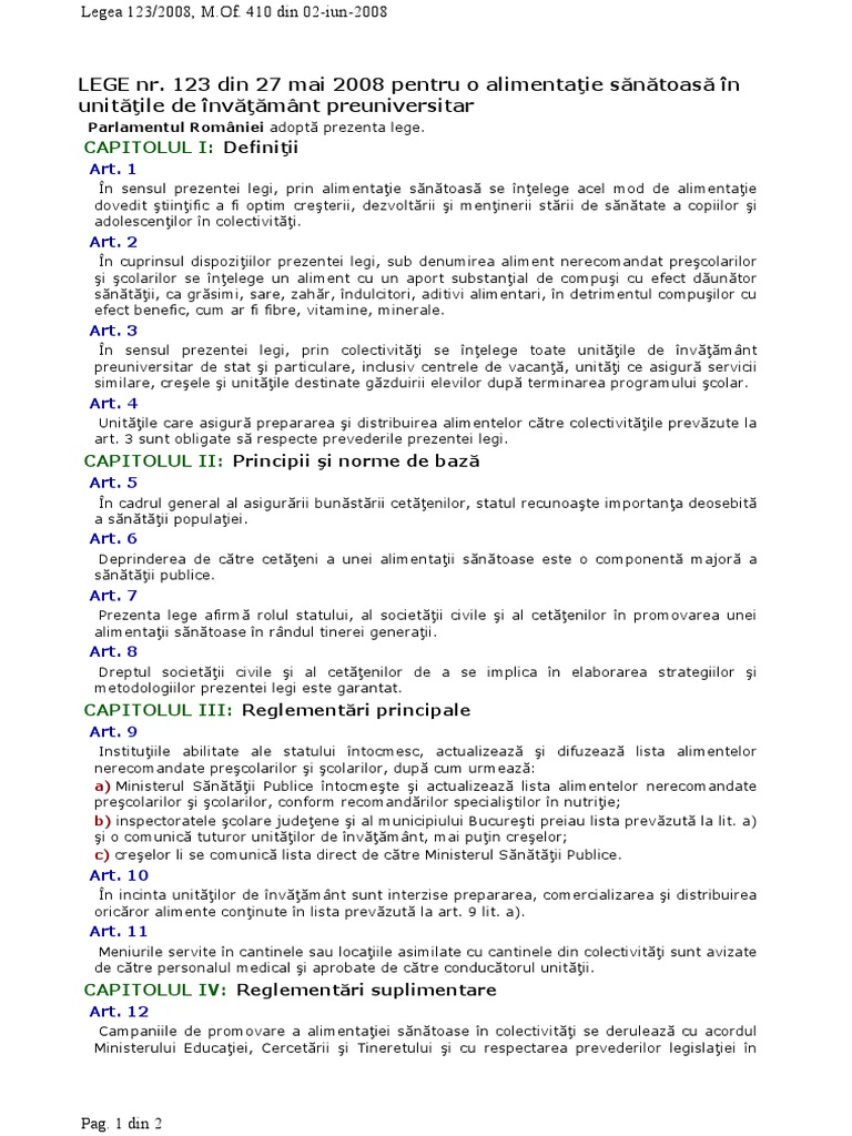 613 din 13 iulie 2020 parlamentul româniei adoptă prezenta lege. Publicat în monitorul oficial nr. 123 2008 pentru o alimentatie sanatoasa in unitatile de invatamant preuniversitar se vor respecta prevederile ordinului ministrului sanatatii nr. Capitolul i definiţii articolul 1 în sensul prezentei legi prin alimentaţie sănătoasă se înţelege acel mod de alimentaţie dovedit ştiinţific a fi optim creşterii dezvoltării şi menţinerii stării de sănătate a copiilor şi adolescenţilor în colectivităţi.