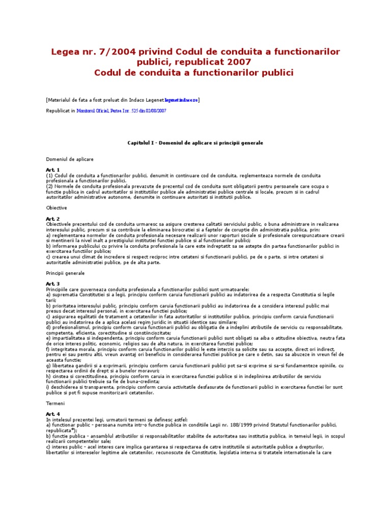 Legea nr 7 2004 privind codul de conduită a funcţionarilor publici republicată. 7 2004 privind codul de conduita a functionarilor publici republicat si actualizat 2016 ca si componenta a structurii organizatorice totalitate a posturilor care au aceleasi caracteristici principale referitoare la obiective sarcini autoritate si responsabilitate. 525 din 02 august 2007. 571 2004 privind protecţia. 7 2004 privind codul de conduită a funcţionarilor publici publicată în monitorul oficial al româniei partea i nr.