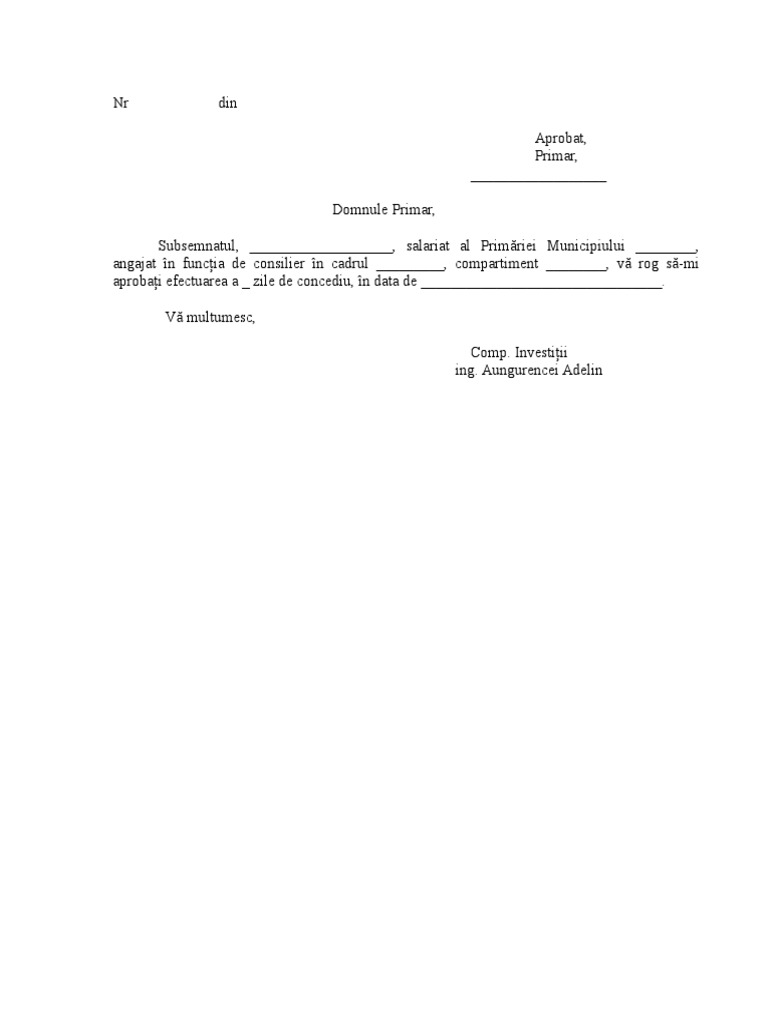 Model cerere adresata primarului. In aceasta cerere se completeaza datele personale ale mamei respectiv datele personale ale noului sau noilor nascuti. Intrebare de la r z. Ai o groapa in fata blocului un crater care te streseaza de 5 ani ai in spatele blocului un teren viran plin de gunoaie locul de joaca al copiilor din coltul strazii este in paragina pe strada pe care stai s au scos bordurile acum 2 ani si tot santierul a fost oprit e momentul sa le rezolvi pe toate citește tot scrisoare catre primar. Cerere pentru eliberarea unui certificat de atestare fiscală privind impozitele taxele locale şi alte venituri la bugetul local pentru persoane fizice model 2016 itl 010 cerere de compensare model 2009 itl 058 cerere de restituire model 2009 itl 059.
