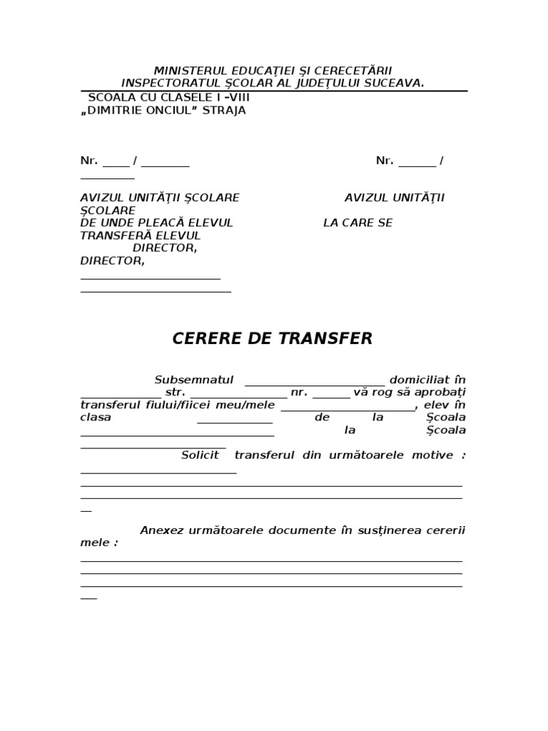 Model cerere de transfer liceu. Anexa 3 cerere transfer 4241 model cerere motivare absente. Ca regula generala elevii se pot transfera de la o scoala la alta doar intre semestre sau in vacanta de. Examenele de diferenţă la disciplinele pe care nu le a studiat la şcoala de unde se transferă. Cererile pentru bursa de ajutor social pentru motivare absente si pentru transfer se tiparesc se completeaza si se depun la serviciul secretariat impreuna cu documentele solicitate.