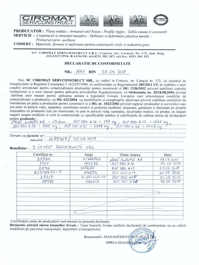 în conformitate cu prevederile art. Sc dumar construct srlare implementat si sistemul de management al calitatii in conformitate cu standardul de referinya iso 9001. 752 din 20 septembrie 2017. Declaratie in conformitate cu prevederile art.