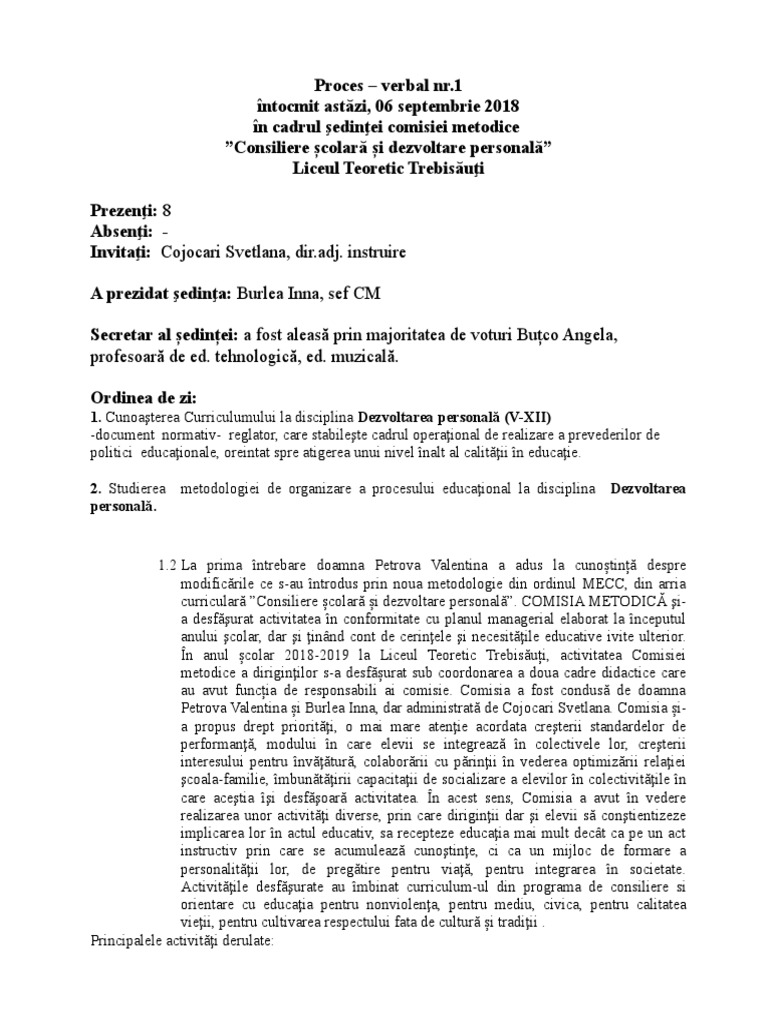 Va prezint doua modele de procese verbale pentru aria curriculara comisia metodica. Iii mandatul comisiei. Q raport de activitate semestrial și anual privind activitatea de perfecționare formare continuă desfășurată de comisie la nivelul școlii. Sefii de catedra vor colecta si dovezile privind participarea personalului la perfectionare copii ale actelor de perfectionare si le vor preda comisiei de perfectionare pe baza unui process verbal.