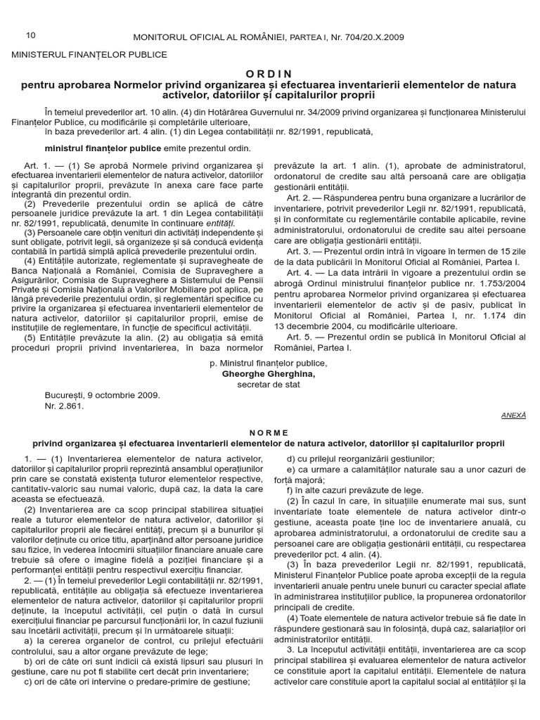 2861 2009 din 9 octombrie 2009 pentru aprobarea normelor privind organizarea si efectuarea inventarierii elementelor de. 704 din 20 octombrie 2009 în temeiul prevederilor art. 2009 10 20 versiune initiala publicata in monitorul oficial. 34 2009 privind organizarea şi.
