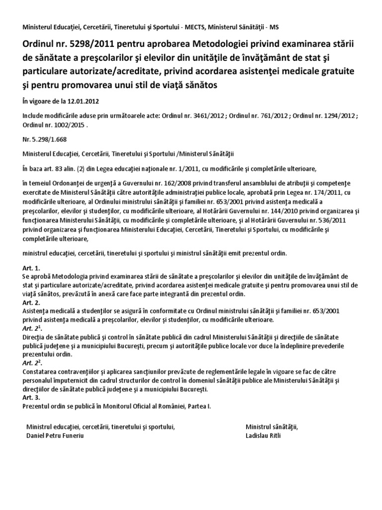 Ordin 1955 din 1995 actualizat 2017. 59bis din 22 03 1996 pentru aprobarea normelor de igiena privind unitatile pentru ocrotirea educarea si instruirea copiilor si tinerilor ministrul sănătăţii văzând nota direcţiei generale a medicinii preventive şi promovării sănătăţii. 286 din 11 decembrie 1995 la 27 09 2018 titlul hotărârii a fost modificat de punctul 1 articolul i din hotărârea nr. Ordinul ministrului sănătăţii nr. 742 din 13 septembrie 2018 publicată în monitorul oficial nr.