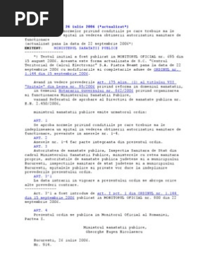 695 din 15 august 2006. 914 din 26 iulie 2006 actualizat pentru aprobarea normelor privind conditiile pe care trebuie sa le indeplineasca un spital in vederea obtinerii autorizatiei sanitare de functionare actualizat pana la data de 22 septembrie 2006 emitent. Ministerul sănătăţii publice ordin nr. Ministerul sănătăţii publice.