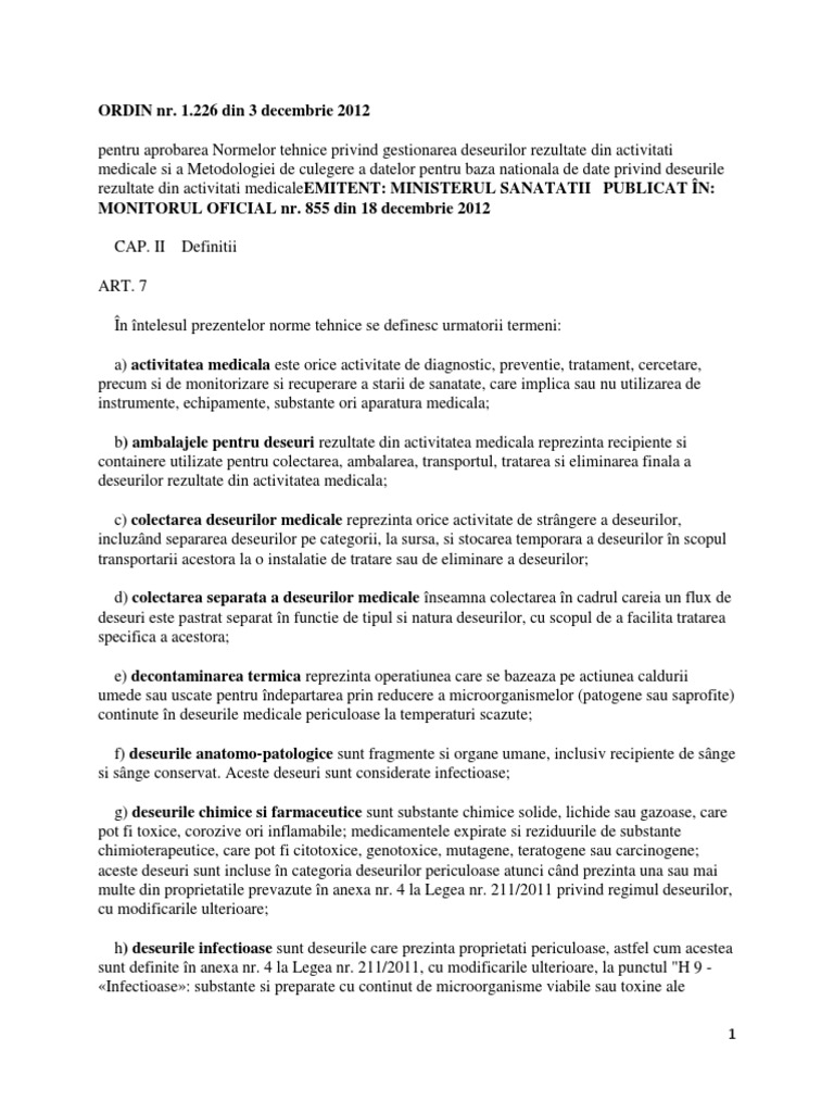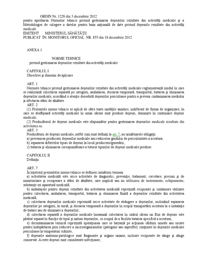 1 226 din 3 decembrie 2012 pentru aprobarea normelor tehnice privind gestionarea deşeurilor rezultate din activităńi medicale şi a metodologiei de culegere a datelor pentru baza nańională de date privind deşeurile rezultate din activităńi medicale. 1 226 din 3 decembrie 2012 pentru aprobarea normelor tehnice privind gestionarea deșeurilor rezultate din. 1226 2012 pentru aprobarea normelor tehnice sulylqgjhvwlrqduhdghúhxuloruuh. Ordin 1226 03 12 2012 portal legislativ.
