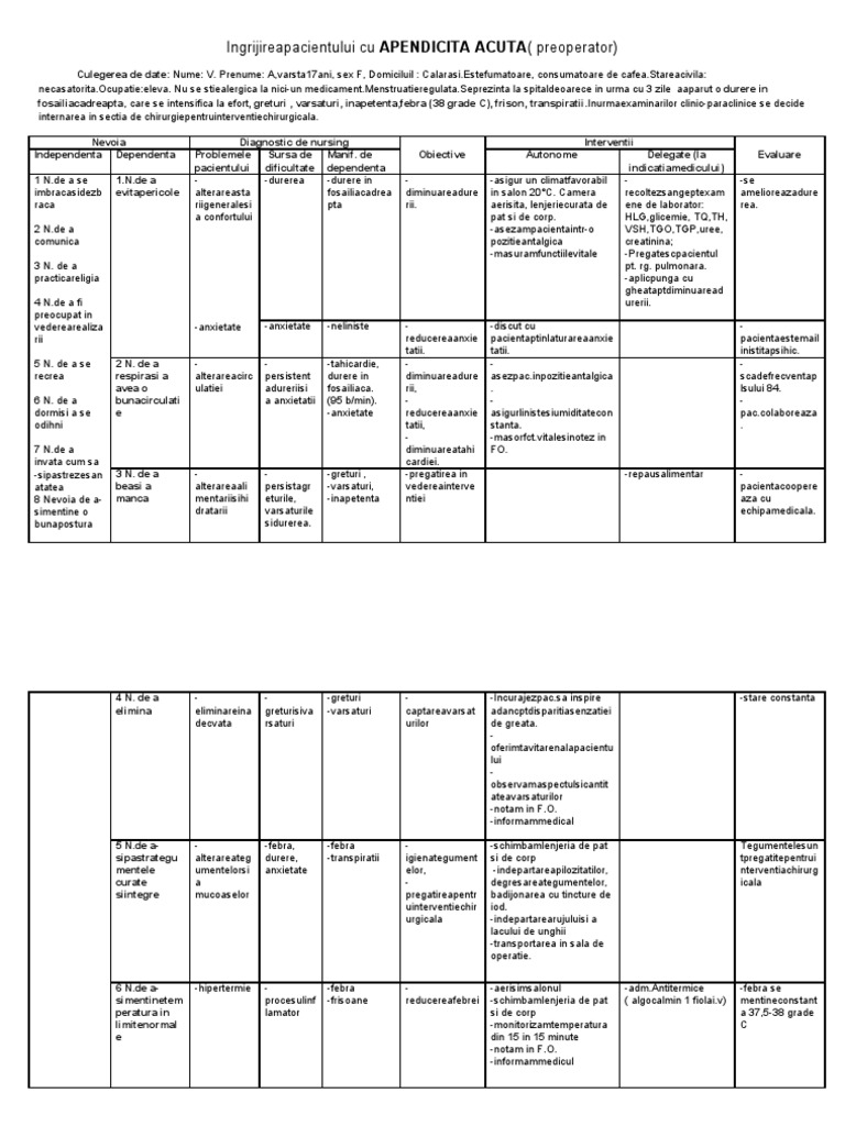 Plan de îngrijire apendicita acuta. Apendicita acuta este o urgenta medicala de aceea forma de internare este cea de urgenta iar internarea pacientilor cu aceasta afectiune se face la serviciul de chirurgie generala. Carusel înapoi carusel înainte. Mai jos poate fi vizualizat cuprinsul si un extras din document aprox.