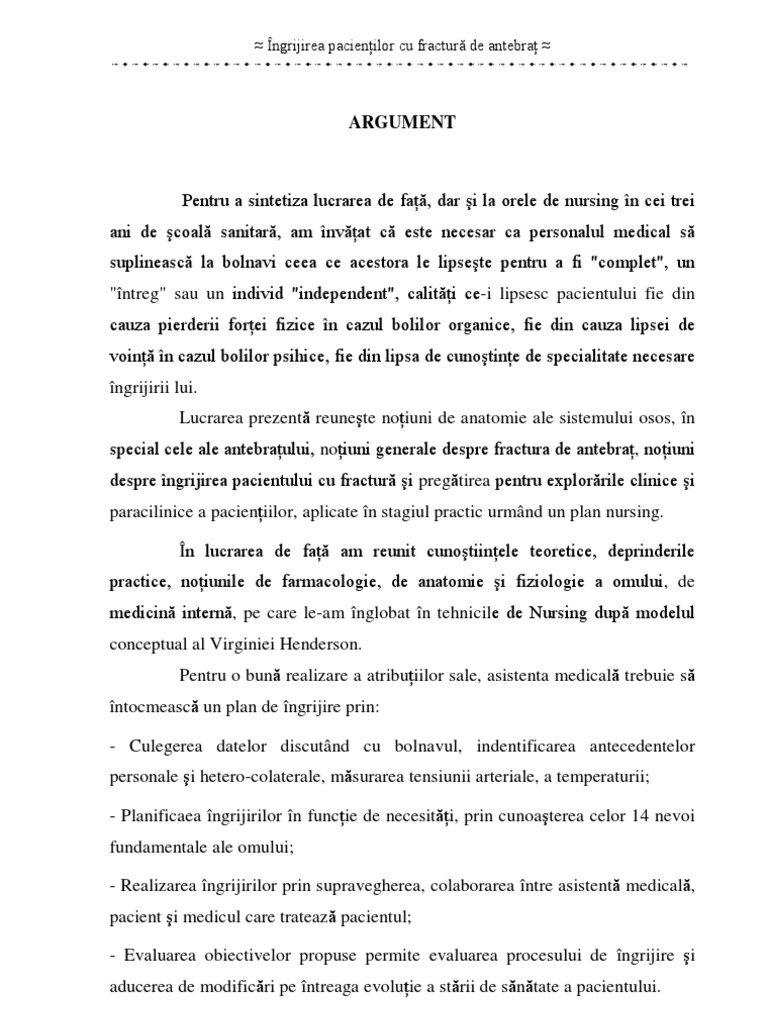 Nevoia de a învăţa cum să şi păstreze sănătatea. Ingrijirea si recuperarea bolnavului cu fractura de. Fracturile antebraţului pot apărea fie printr un mecanism direct cum este în fractura de apărare la o lovitură fie prin unul indirect ca cele când este accentuată curbura osoasă normală de exemplu în căderile pe mână prin smulgere sau prin compresie în cazuri mai rare. Mai jos poate fi vizualizat cuprinsul si un extras din document aprox.