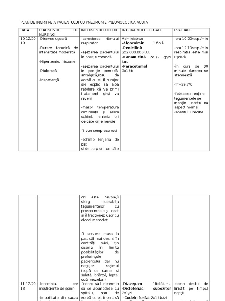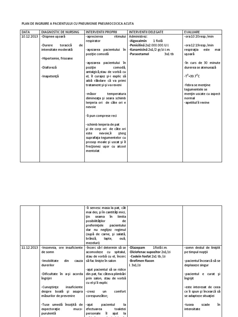 Diagnosticul de nursing. Mai jos poate fi vizualizat un extras din document aprox. 12 nevoia de a actiona conform propriilor credinte. Plan de ingrijire pt pneumonie pneumococica nursing in pneumonia pneumococica la copil nursa care participa la ingrijirea unui pacient cu pneumonie pneumococica necesita cunostinte temeinice de nursing general si special pentru a putea sa puna corect diagnosticul de nursing si sa aplice interventiile potrivite in functie de faza evolutiva a bolii.