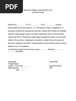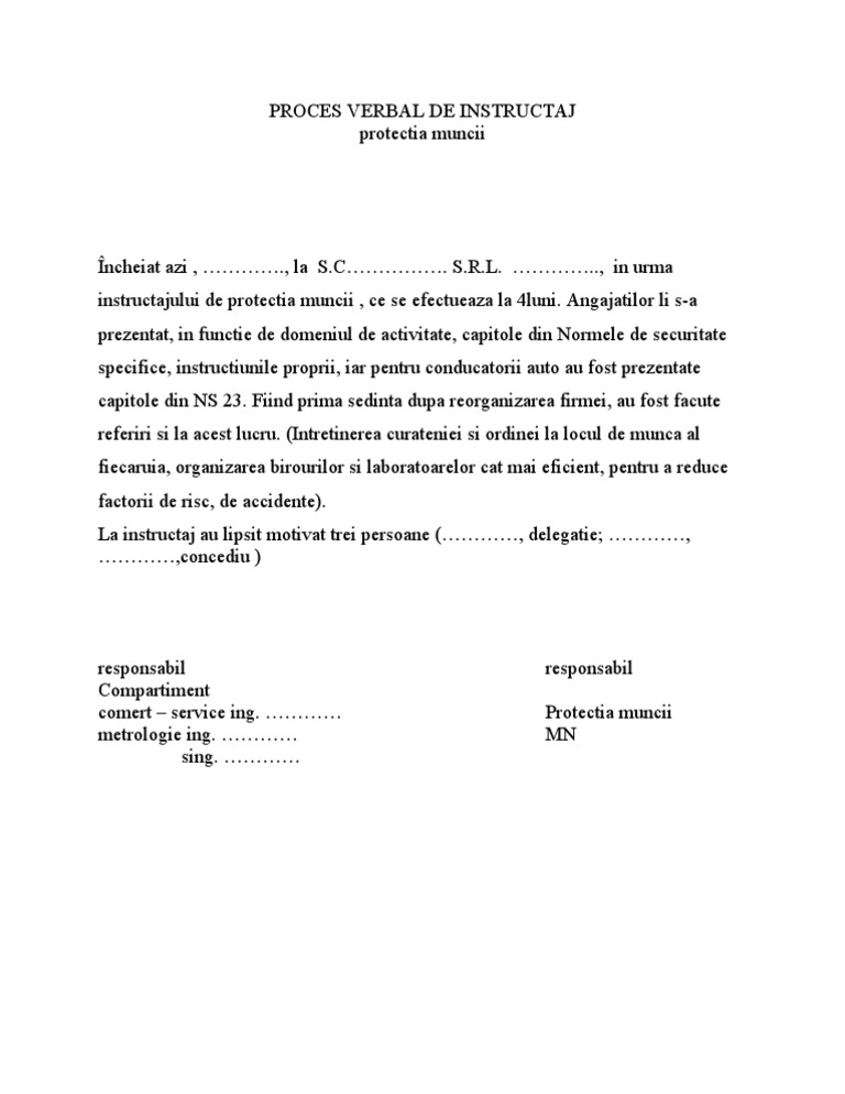 2 contravenientul poate achita pe loc sau in termen de cel mult 48 de ore de la data incheierii procesului verbal ori dupa caz de la data comunicarii acestuia jumatate din minimul amenzii prevazute de lege corespunzator faptei pentru care a fost sanctionat inspectorul de munca facand mentiune despre aceasta posibilitate in procesul verbal. Ce teste efectuam pentru verificarea celor 3 faze de instruire ssm. Testele necesare pentru verificarea celor 3 faze de instruire prin ce mijloace se asigura instruirea in domeniul prevenirii si stingerii incendiilor si al protectiei civile instruire ssm si a. Proces verbal cu persoanele participante la instruire am luat la cunostinţă cu privire la materialele prelucrate şi consemnate în fişa colectivă de instructaj pentru securitatea muncii şi în domeniul psi riscurile de accidentare şi îmbolnăvire profesională şi ne obligăm să le respectăm întocmai.