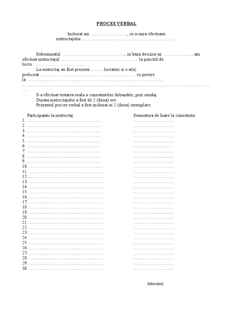 Proces verbal de instruire pentru membrii comisiei de inventariere inventar anual 31 12 2017 de către. Proces verbal de depunere a cererilor de contestatii la centrele de evaluare proces verbal de instruire a asistentilor proces verbal de predare a lucrarilor scrise ale candidatilor catre asistenti. întocmita azi subsemnatul având funcţia de am procedat la instruirea unui număr de persoane de la conform tabelului nominal de pe verso în domeniul securităţii şi sănătăţii în muncă pentru vizita prezenţa în întreprindere unitate în zilele. Proces verbal de compensare fara imi a facturilor reciproce.