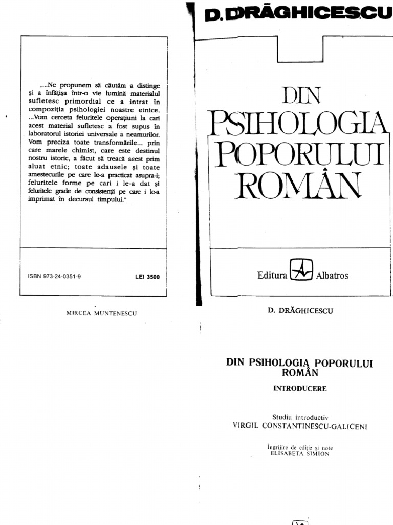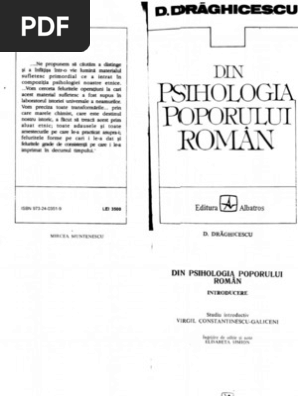 O carte care sintetizeaza cea mai ampla cercetare de psihologia poporului roman din ultimul veac cercetare derulata intre anii 2005 si 2015 si ofera un profil psihologic al romanilor ce contrazice nu de putine ori bine cunoscutele clisee care circula despre acesta. V am lasat deschisa sectiunea comentarii in acest sens. Le cler vedea in noi in minunea conservdrii noastre sem nele speranta unui popor ales de. D draghicescu din psihologia poporului roman pdf there is document d draghicescu din psihologia poporului roman pdf available here for reading and downloading.