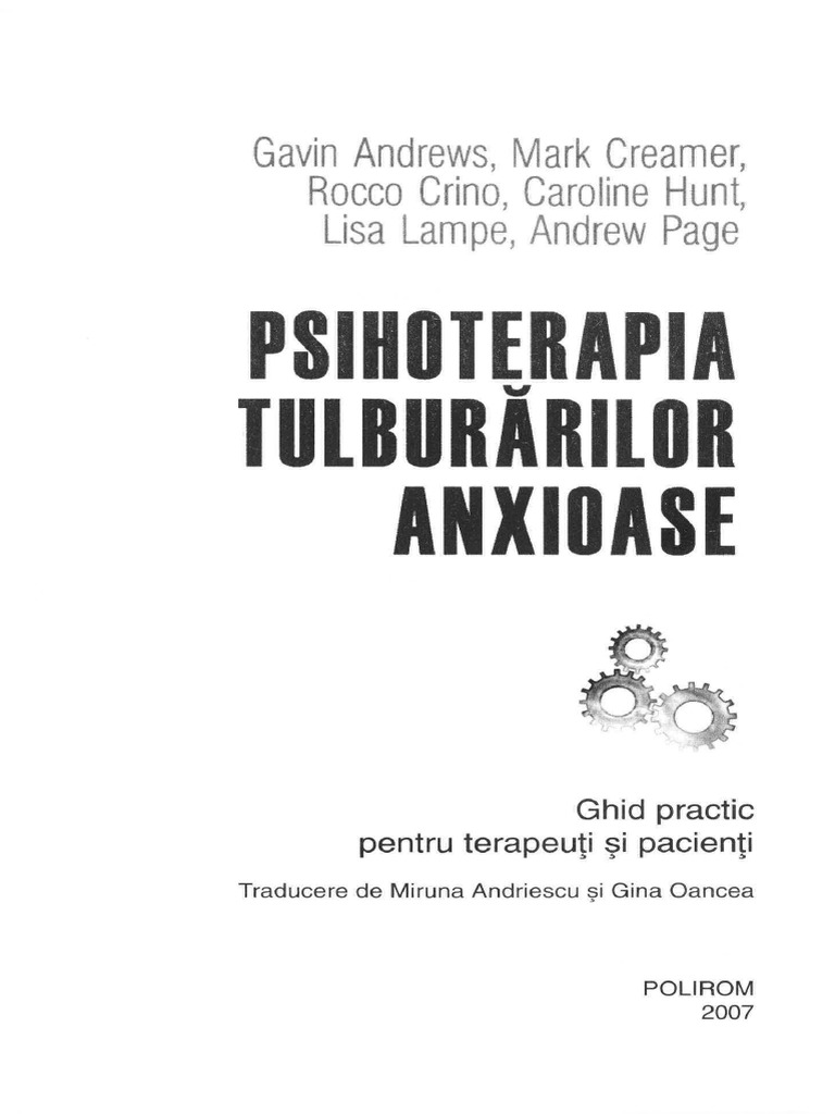 Editura polirom a publicat la inceputul acestui an in colectia psihologie clinica si psihoterapie cartea psihoterapia tulburarilor anxioase. 2 aspecte generale ale tulburarilor anxioase 19 3 aspecte generale ale tratamentului. Ghid practic pentru terapeuti si pacienti de gavin andrews mark creamer rocco crino caroline hunt lisa lampe. Sindrom 63 5 tulburarea de panica si agorafobia.