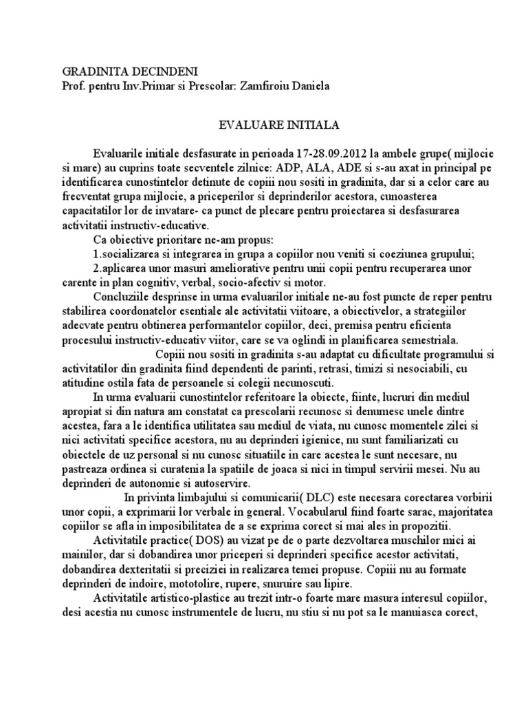 Raport narativ evaluare initiala grupa mijlocie. Evaluare inițială pe domenii experențiale. Planificarea activităților instructiv educative la grupa mare nivel ii pe perioada primelor două săptămâni de activitate totodată s au sistematizat obiectivele operaționale itemii și mijloacele de realizare. 0 stele 0 review uri.