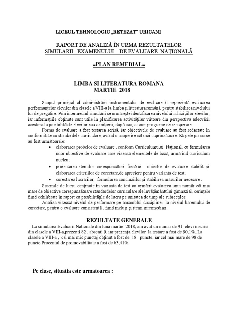 0 stele 0 review uri. Raport privind rezultatele la simularea evaluărilor naţionale febr 2016 în cadrul simulării examenului de evaluare naţională pentru elevii de clasa a viii a din perioada 22 23 februarie 2016 s a avut în vedere respectarea omen nr 5144 2014 precum şi a procedurii ce reglementează organizarea şi desfăşurarea simulării en. Spor la lucru eu am lucrat 3 zile. Raport de analiza a simularii evaluarii nationale cls a viii a 2017 sper sa le fie de folos colegilor pentru inspiratie.