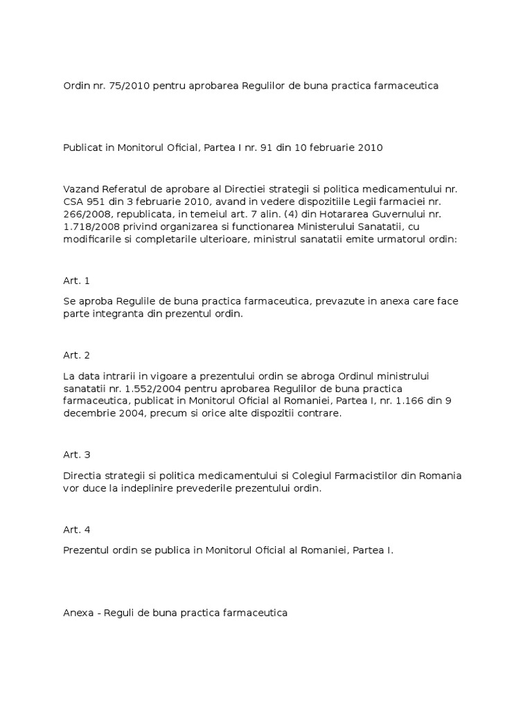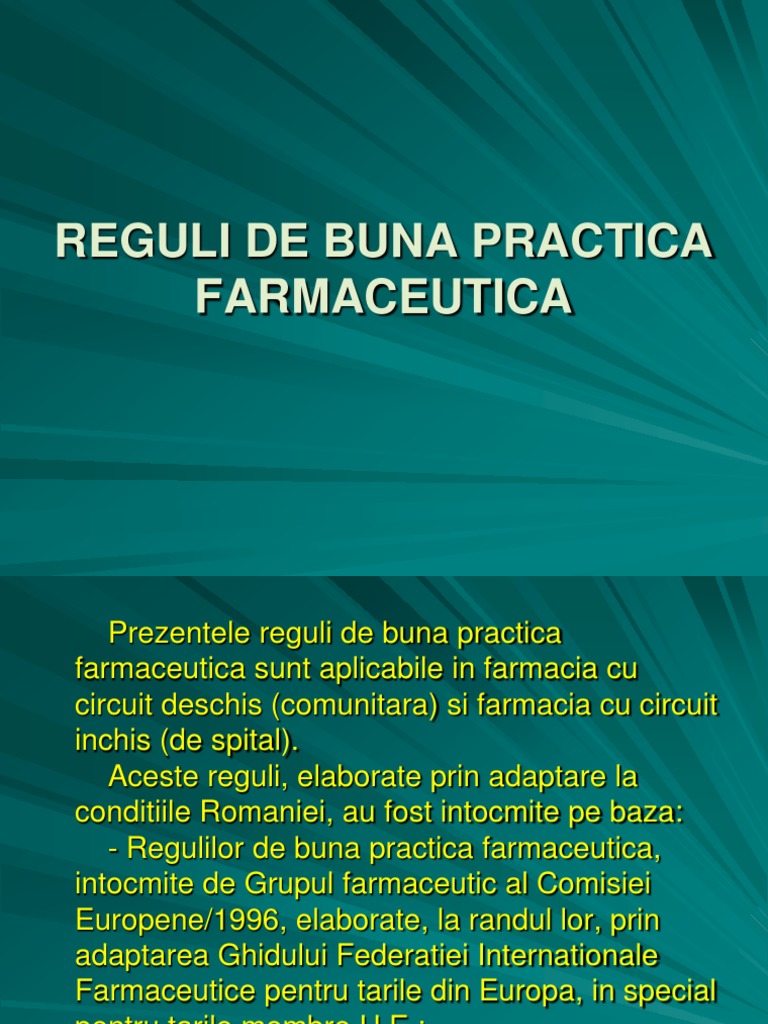Reguli de buna practica farmaceutica. Regulilor de buna practica farmaceutica intocmite de grupul farmaceutic al. 75 2010 se face de către colegiul teritorial al farmaciştilor în raza căruia funcţionează farmacia. 4 4 reguli de bun ă practic ă privind eliberarea medicamentelor pe baza prescrip ńiei medicale a celorlalte medicamente şi produse de s ănătate 4 5 reguli de bun ă practic ă privind încurajarea utiliz ării ra ńionale a medicamentelor 4 6 reguli de bun ă practic ă privind prepararea medicamentelor în farmacie. Aceste reguli elaborate prin adaptare la conditiile romaniei au fost intocmite pe baza.