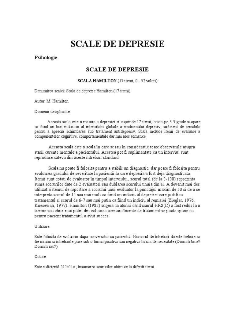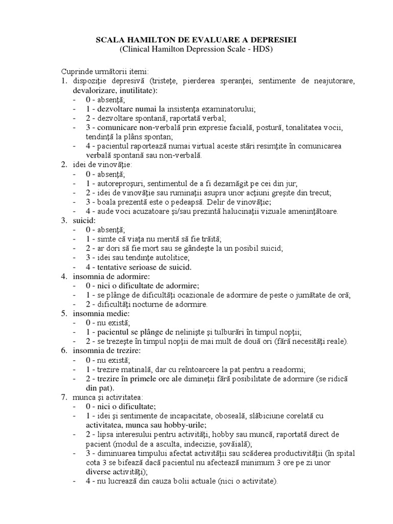 22 iulie 2019 la 22 16 imi pare rau andreea. 9 octombrie 2019 la 21 17 si eu am probleme. Acesti ittemi sunt cotati de la 0 la 2 sau de la 0 la 4 pentru scala hamilton cu 17 itemi totalul scorului variaza de la 0 la 50. Tulburări de somn sau de apetit.