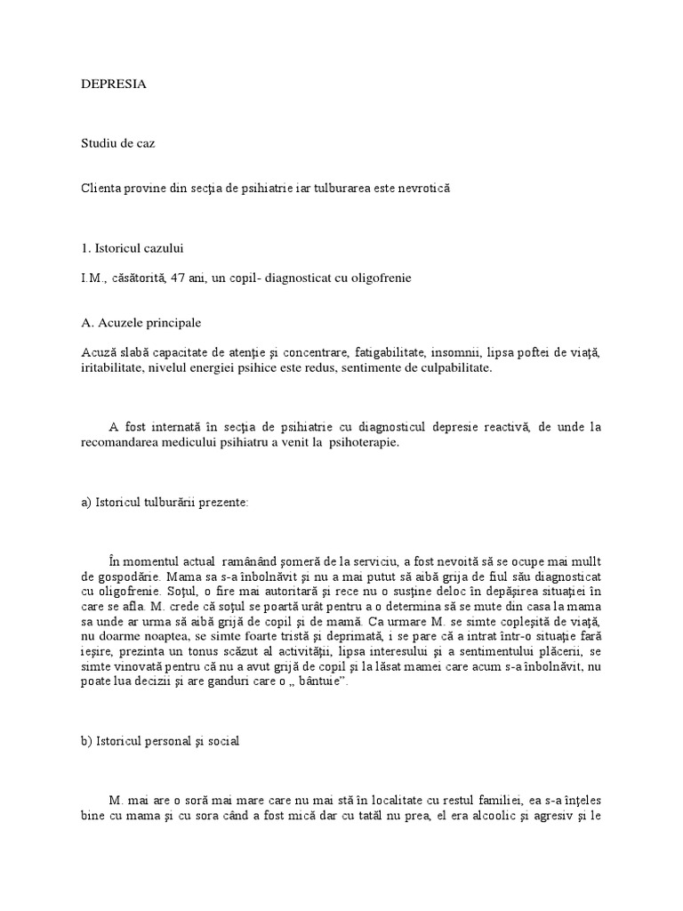 Studiu de caz depresie. Profesor indrumator prezentat profesorului. Asemeni oricarei alte forme de energie anxietatea poate dauna in doze prea mari pentru a putea fi folosita ea trebuie dozata optim nu poti fi anxios fara a fi o persoana cu foarte multa imaginatie persoanele lipsite de imaginatie traiesc rareori stari de anxietate. Persoanele care suferă de depresie prezintă și simptome de anxietate tulburări de somn. Studiu de caz clienta provine din secia de psihiatrie iar tulburarea este nevrotic.